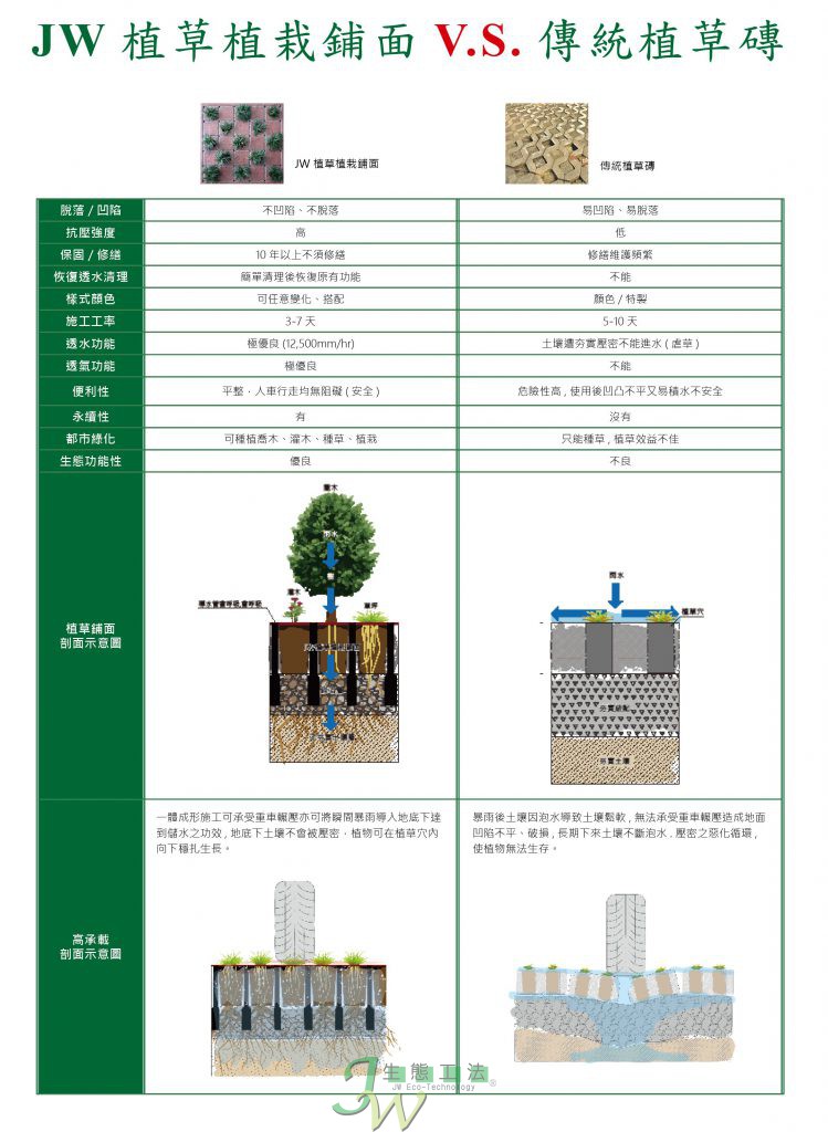 產品介紹 產品特色 適用地點 優勢 各類透水鋪面比較 施工程序 JW植草植栽鋪面 產品特色 會呼吸、高抗壓、高透水,種菜、植草,建築綠化及保水,表面色彩繽紛變化, 能活化土壤提供微生物生存的空間,改善環境品質。 適用地點 1.景觀綠美化2.停車場3.花園4.農園(農田)5.公園6.學校、公共場所及所有需要綠化植草、種樹的地方 戶外農園中壢工業區停車場中央研究院停車場戶外農園福建省建設廳停車場戶外農園停車場戶外農園 優勢 1.一體成型長期保持平整,不脫落、節省維修經費、價格便宜 2.安全、永續(可使用10年以上),平整不損壞 3.抗壓強度高(可承受重車、坦克、飛機) 4.會呼吸、可捕捉二氧化碳、能吸附塵埃,清淨空氣 5.回補地下水、雨水回收、減少地表徑流、滯洪防災 6.循環透氣、降低溫室熱島 7.植栽綠化、種菜種花形成都市開心農場,食用觀賞又可有善環境,賞心悅目、怡情養性兩相宜 JW生態工法植草鋪面與傳統植草磚-特性比較 施工程序 施工依案件特性不同而因地制宜,有關施工程序,因業主需求而定,請洽專業人員。